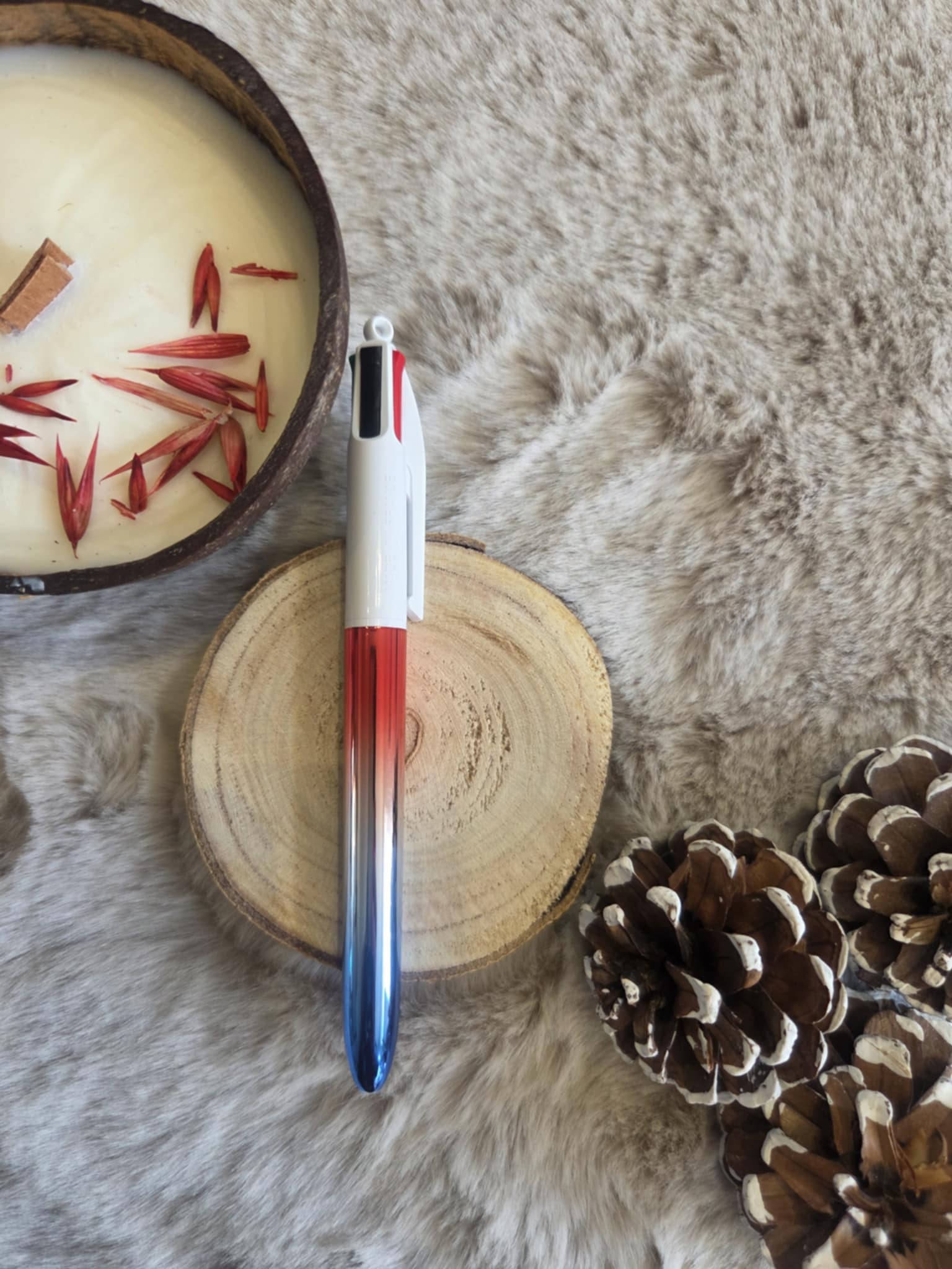 Bic 4 couleurs dégradé de rouge, gris et bleu métallisé